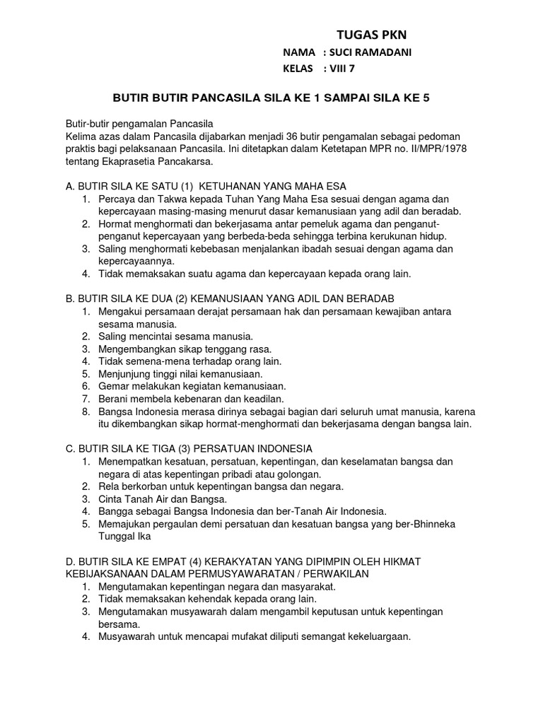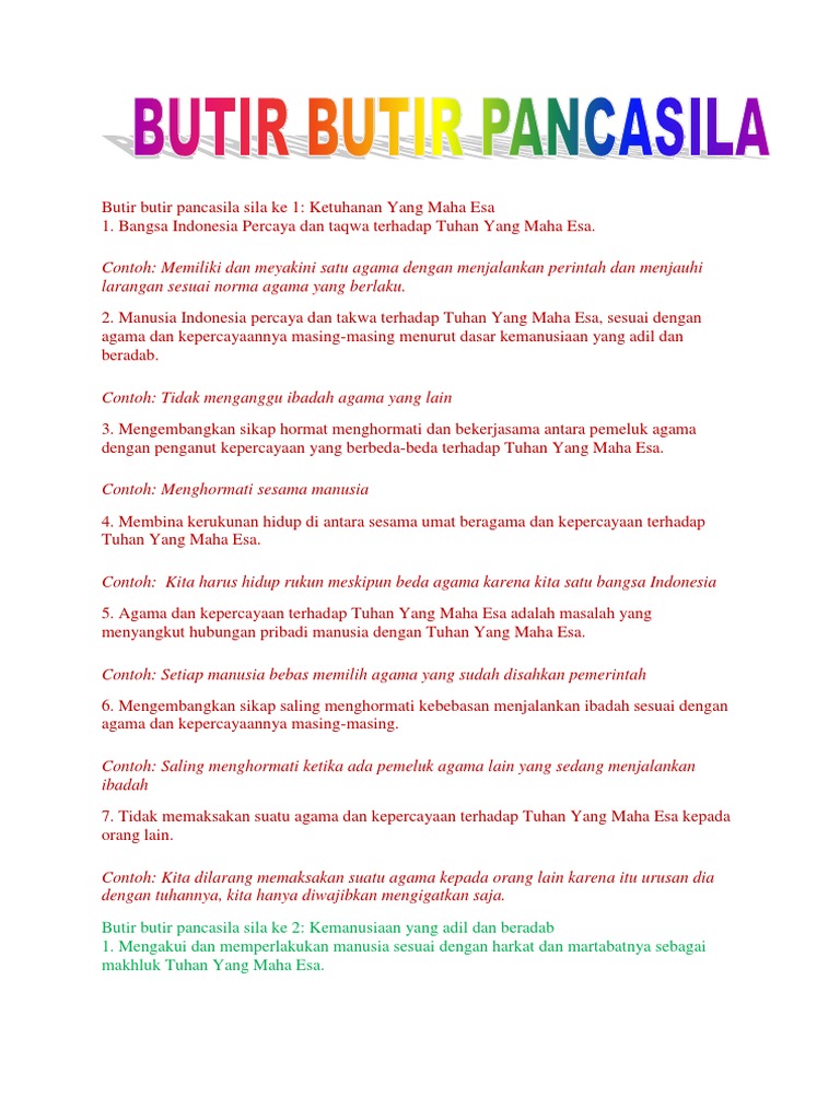 Butir Butir Pancasila Sila Ke 1. Percaya dan taqwa kepada tuhan yang maha esa. Saling hormat atau saling menghargai dan saling bekerjasama antar pemeluk agama. Indonesia menyerukan kepercayaanya dan ketaqwaanya kepada tuhan yme. Academia.edu no longer supports internet explorer. (1) bangsa indonesia menyatakan kepercayaannya dan ketaqwaannya terhadap tuhan yang maha esa. (1) mengembangkan perbuatan yang luhur, yang. Berdasarkan keputusan dari tap mpr no. Sila 1 pancasila menyebut dengan jelas bahwa indonesia adalah negara berketuhanan yang maha esa. Kemanusiaan yang adil dan beradab mengakui dan memperlakukan manusia sesuai harkat dan martabatnya sebagai makhluk tuhan yang maha esa. Kemanusiaan yang adil dan beradab. Pada p4, terdapat 36 buah butir pancasila. I/mpr/2003 terdiri atas sebelas poin, yaitu sebagai berikut: Mengembangkan sikap adil terhadap sesama. Kerakyatan yang dipimpin oleh hikmat kebijaksanaan dalam permusyawaran dan perwakilan. Tidak memaksakan suatu agama dan kepercayaan kepada orang lain.